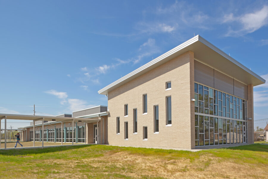 This project included a freestanding addition to the existing middle school consisting of traditional classrooms, a dedicated classroom for special needs students, and a dance studio. The linear orientation of the campus plan gives the Life Skills program a prominent position near the front of the school and integrates the jewel-box dance studio with the interior of the campus.