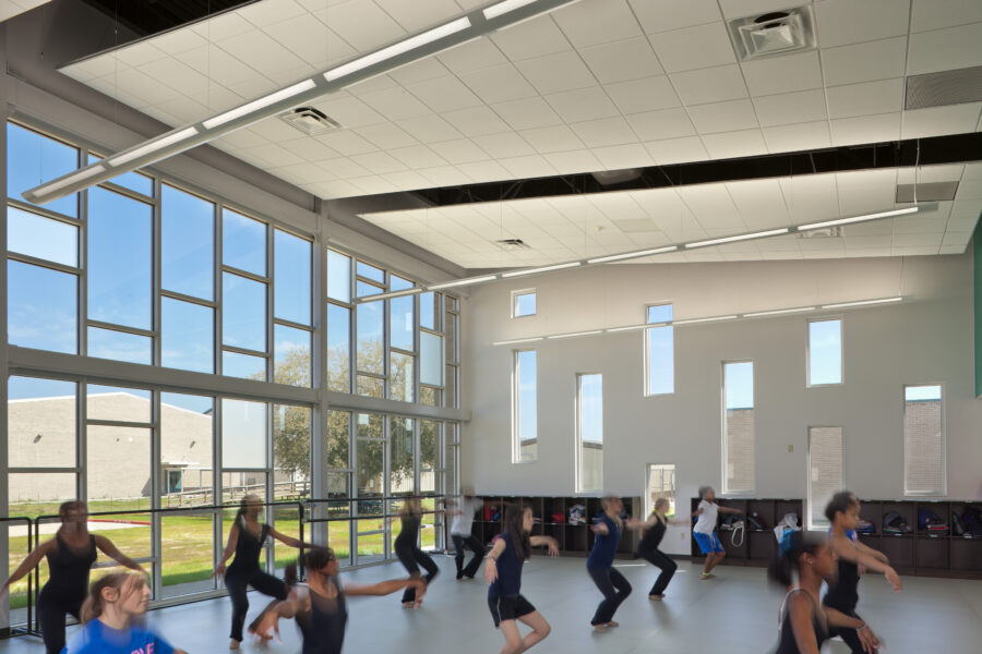 The dance studio features a large north-facing window wall and flying roof to maximize daylighting while reducing heat load from direct sun.
